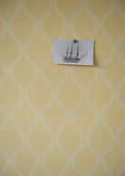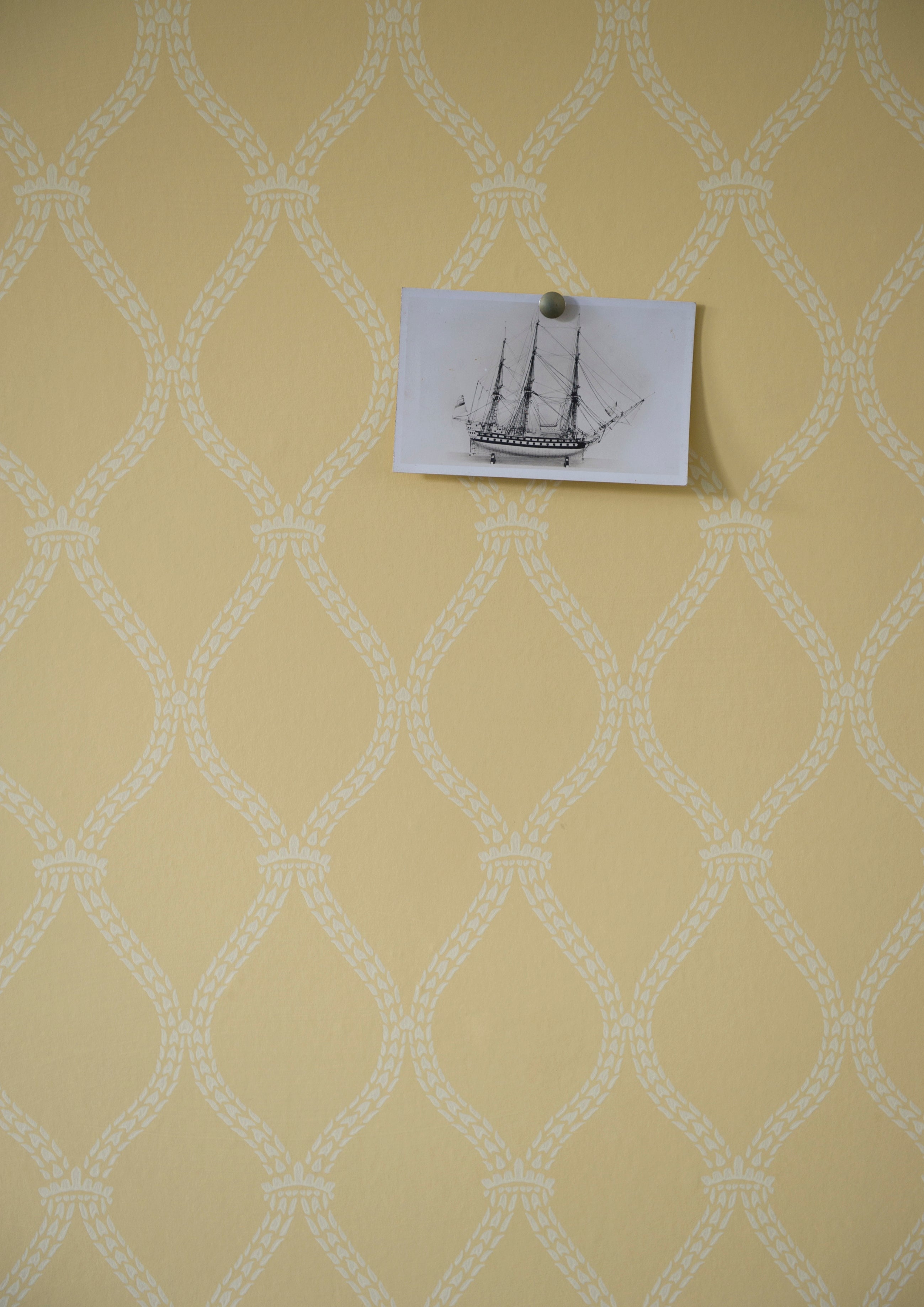 Featuring graceful lines detailed with wheat motifs and crowned intersections, this curved trellis pattern flows rhythmically along the length of the paper, creating a refined and elegant visual effect.